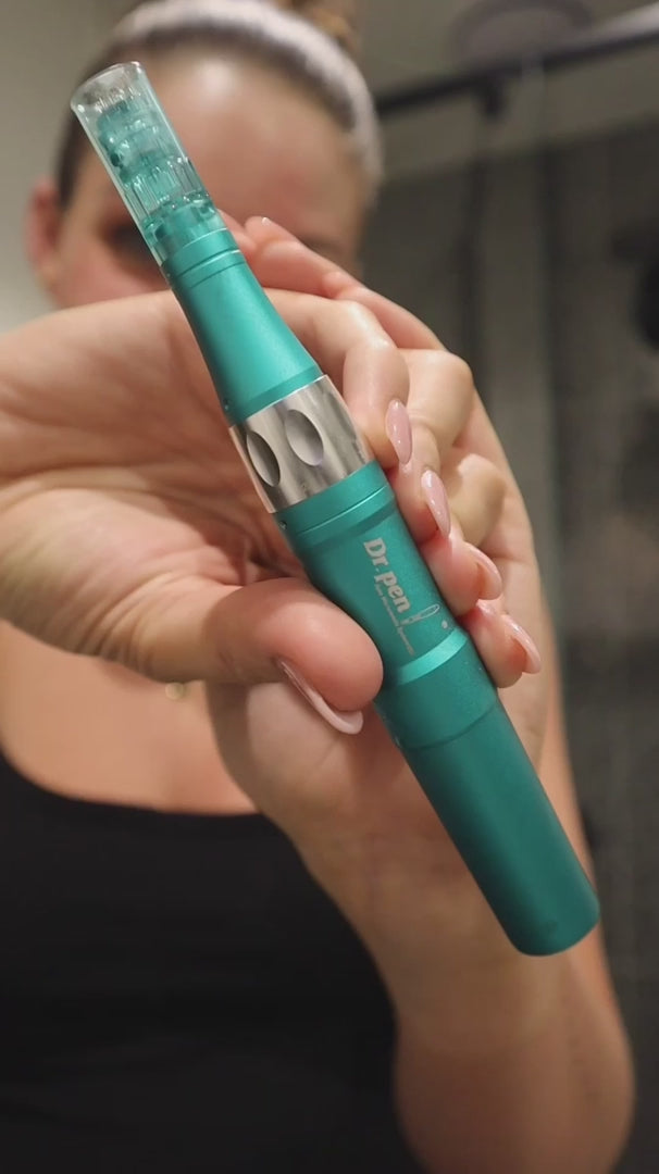 Each Dr Pen device has a cartridge with tiny needles attached. When you turn your device on and place it the area you wish to treat, the cartridge needles will pulsate and glide along the skin to penetrate the upper layers of your skin to create deliberate trauma and micro-wounds. These wounds trigger a healing response from the body, which responds by producing collagen and elastin fibers. Over time, the skin becomes rejuvenated and reduces the appearance of fine lines, scarring, hyperpigmentation, loose skin and will brighten and improve your overall texture and tone. Read more about how microneedling works here.